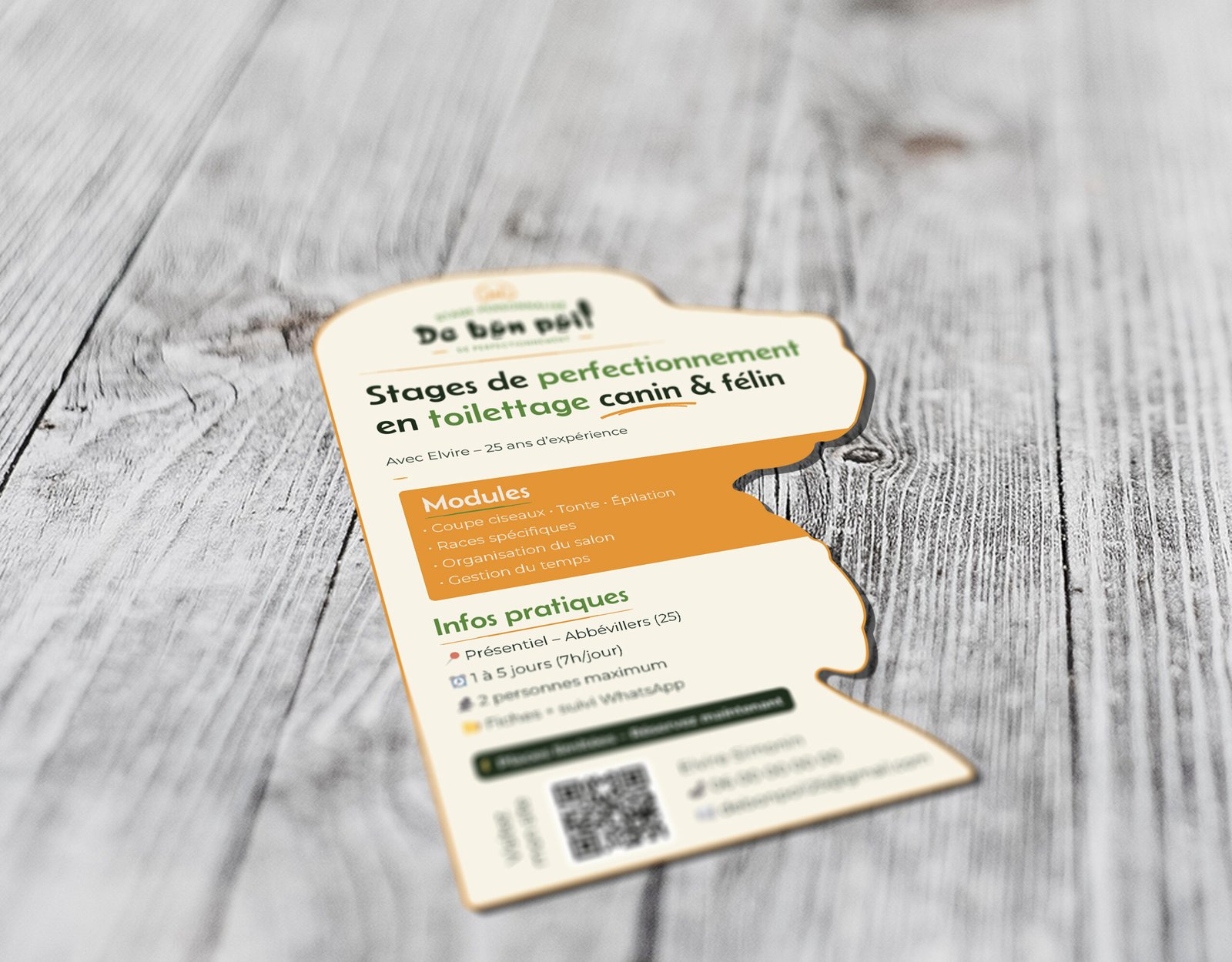 Nous avons accompagné De Bon Poil, salon de toilettage canin et félin, dans le développement d’un nouveau service de formation professionnelle, à destination de toiletteuses et toiletteurs déjà en activité. Le projet a couvert la création d’une identité dédiée aux stages, ainsi que l’ensemble des supports de communication print et digitaux, dont un site web entièrement pensé pour ce nouveau positionnement.